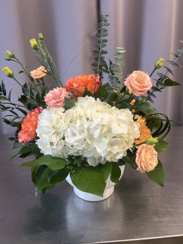 Bursting with warm peach, coral and golden tones, Citrus Blush is a joyful arrangement anchored by lush white hydrangea and delicate lisianthus. Fresh bright and effortlessly happy, this design bring a pop of sunshine to any space!
