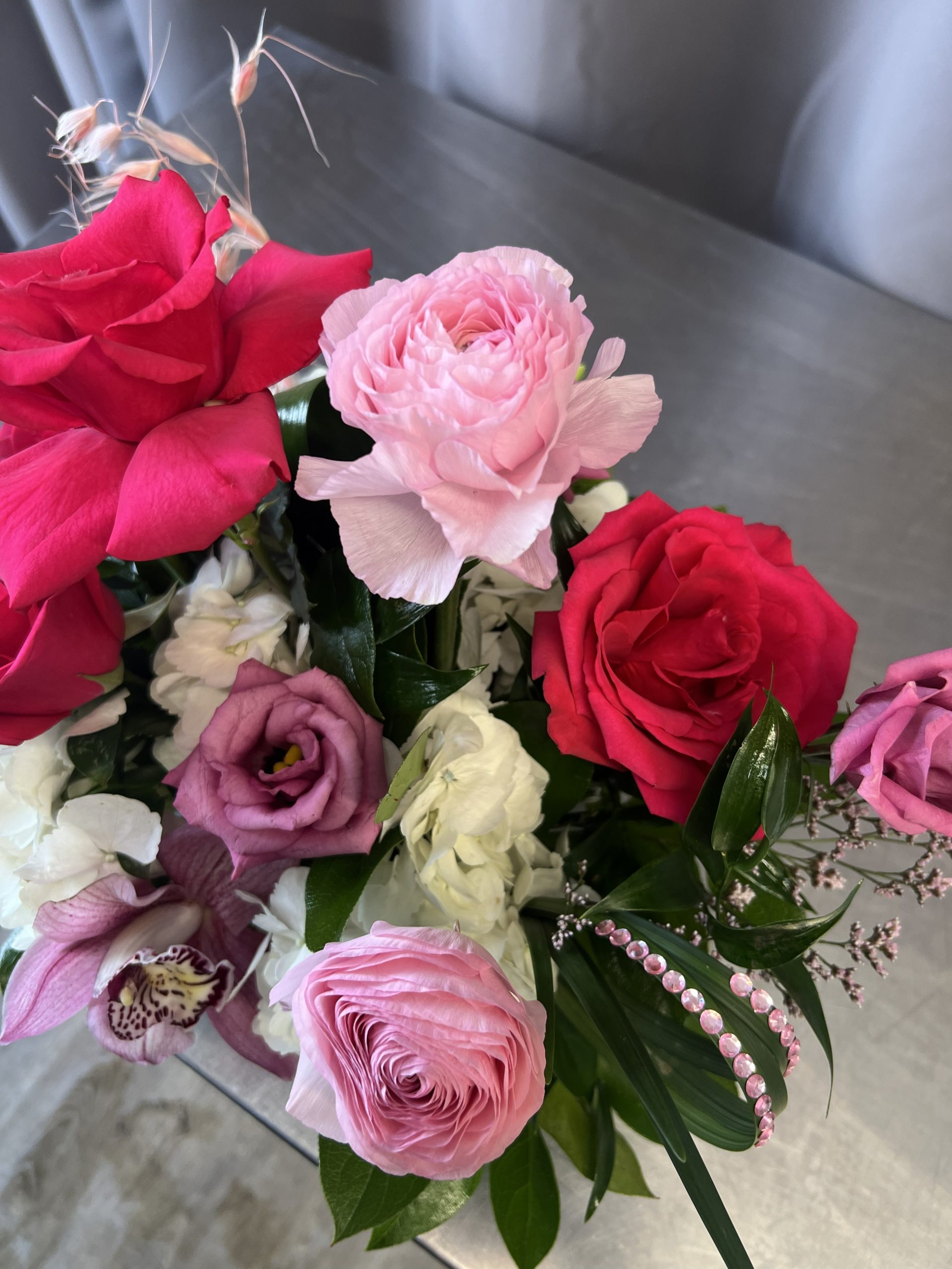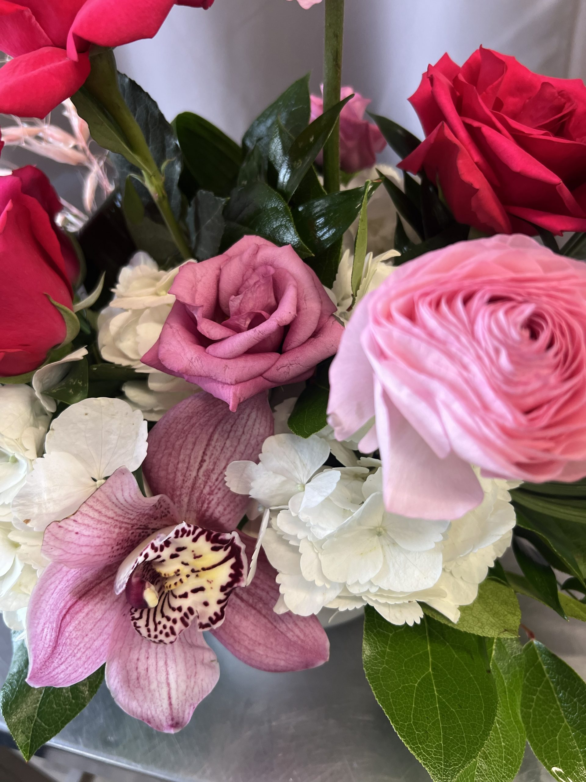 Bold, passionate, and impossible to ignore You Drive Me Crazy is a love struck mix of fiery roses, soft blush blooms, and lush white hydrangea, crowned with a striking orchid that steals the spotlight. Designed with playful movement and dramatic contrast, this arrangement captures that heart-racing, can’t-stop-thinking-about-you kind of love. Perfect for when ordinary romance just won’t do.