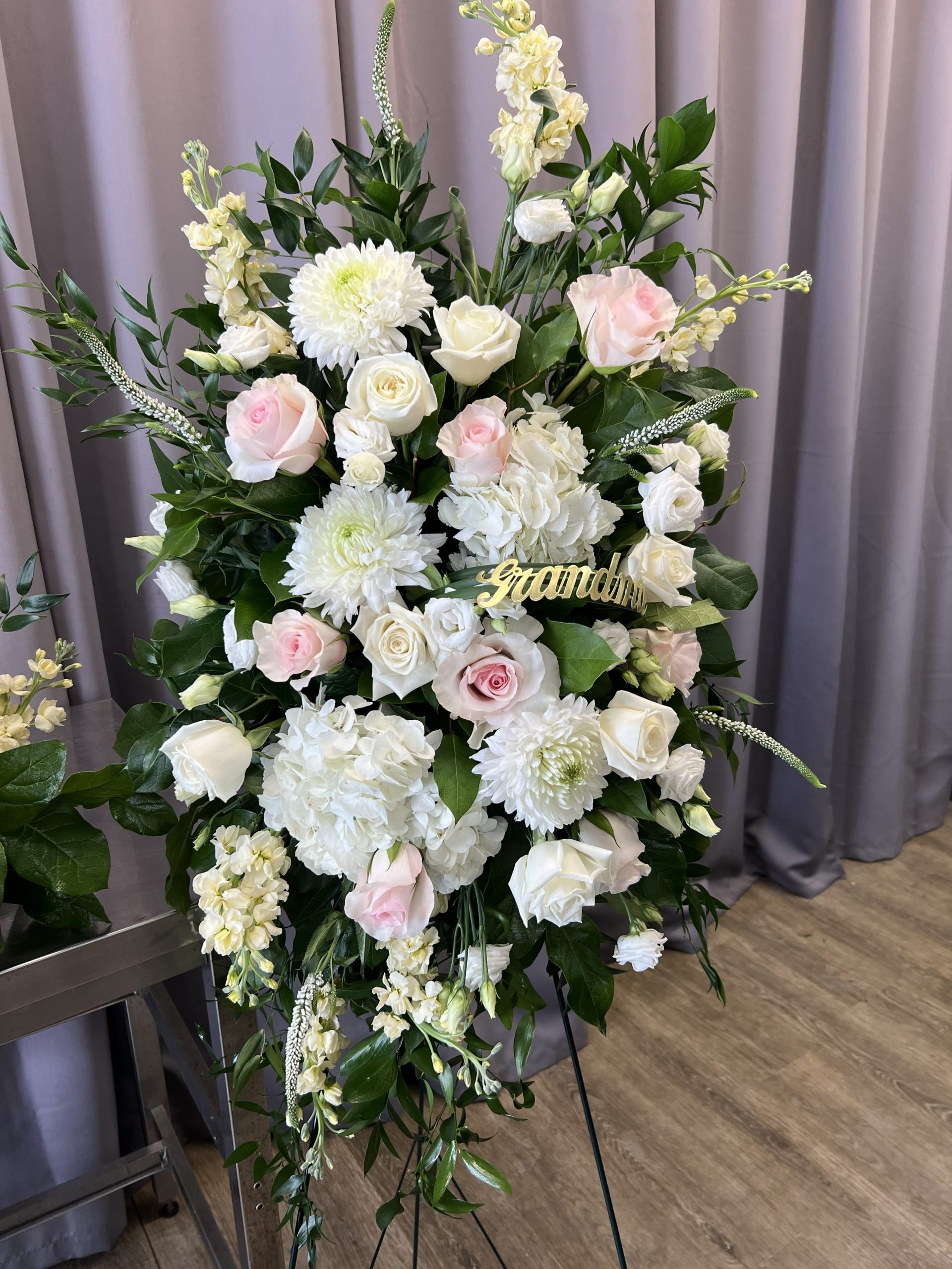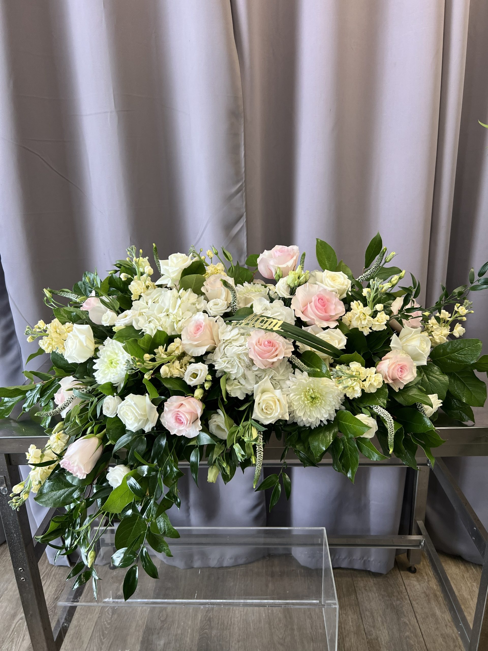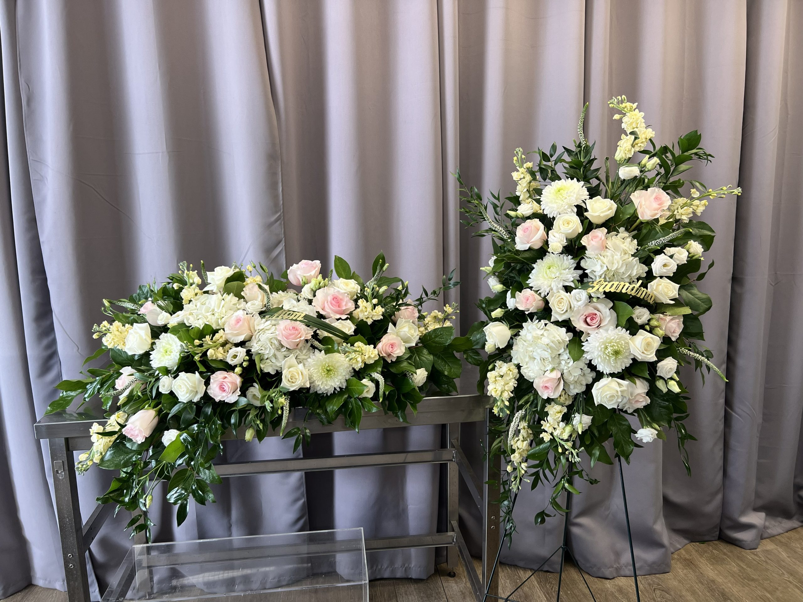 Everlasting Embrace is a thoughtfully paired funeral tribute featuring a lush casket spray and a coordinating standing arrangement. Designed in soft whites and gentle blush tones, this package combines roses, hydrangea, and seasonal blooms with flowing greenery to honor a life deeply loved. Elegant and serene, it offers a unified expression of remembrance, comfort, and enduring devotion