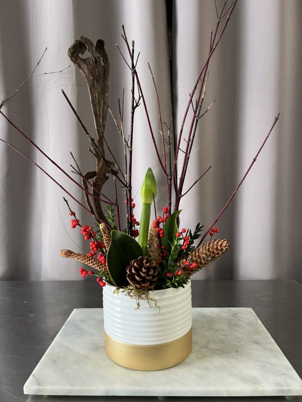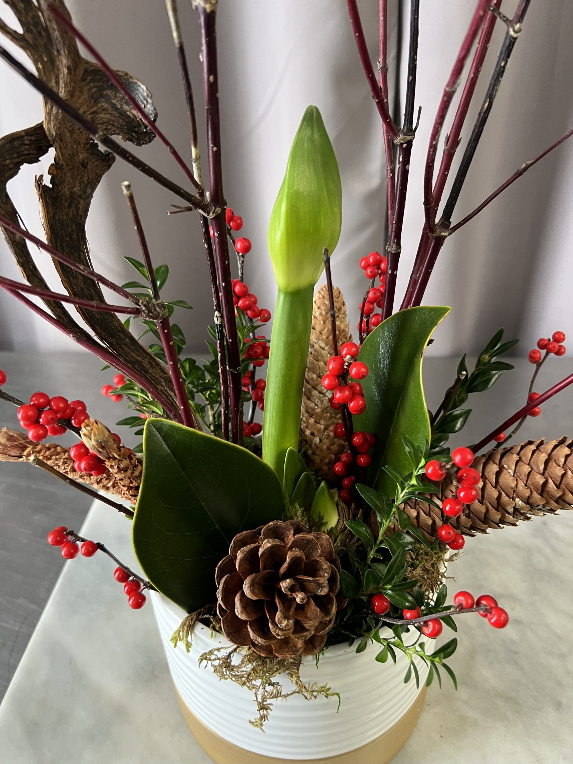 Amaryllis planted in a nice ceramic pot, dressed up with moss, twigs, pine cones other winter elements or call to customize to your preferences, like Christmas ornaments or a touch of Christmas sparkle
