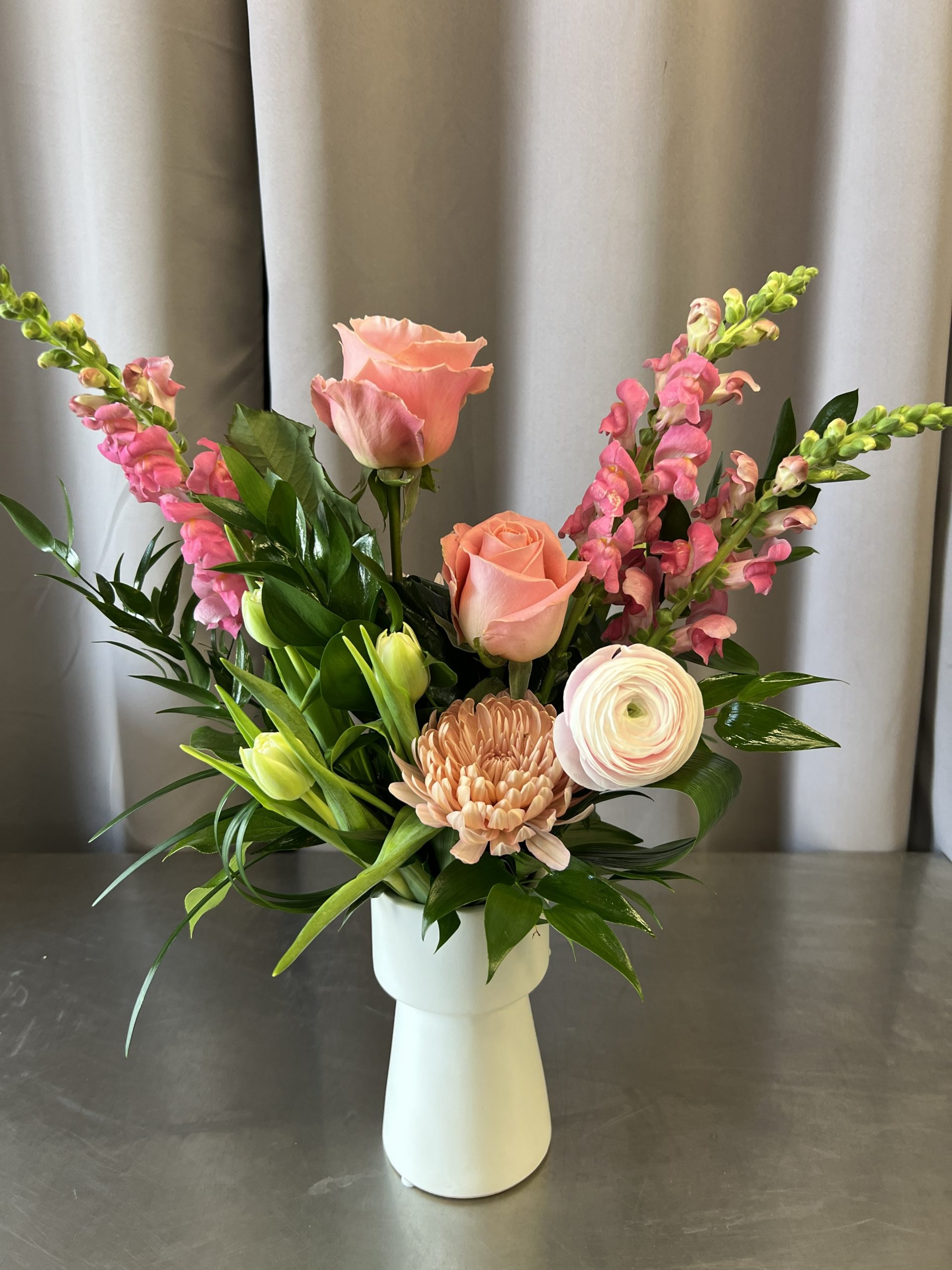 My Little Beauty is a sweet celebration of love, blending soft blush and peach blooms in a design that feels tender and heartfelt. Romantic roses and delicate accents rise from lush greenery in a modern white vase. A charming little reminder that love, in all its beauty, speaks volumes.