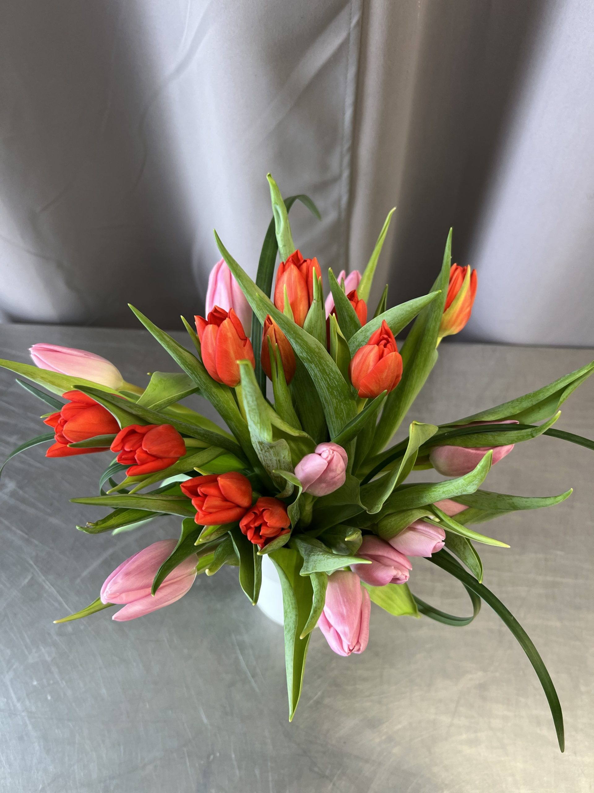 A sweet and flirty 20 stem mix of tulips gathered in a sleek white or black ceramic vase. Tu-Lip Kiss is a modern gesture that says it all without saying too much. Fresh, romantic, and effortlessly chic, perfect for sealing love with a kiss.