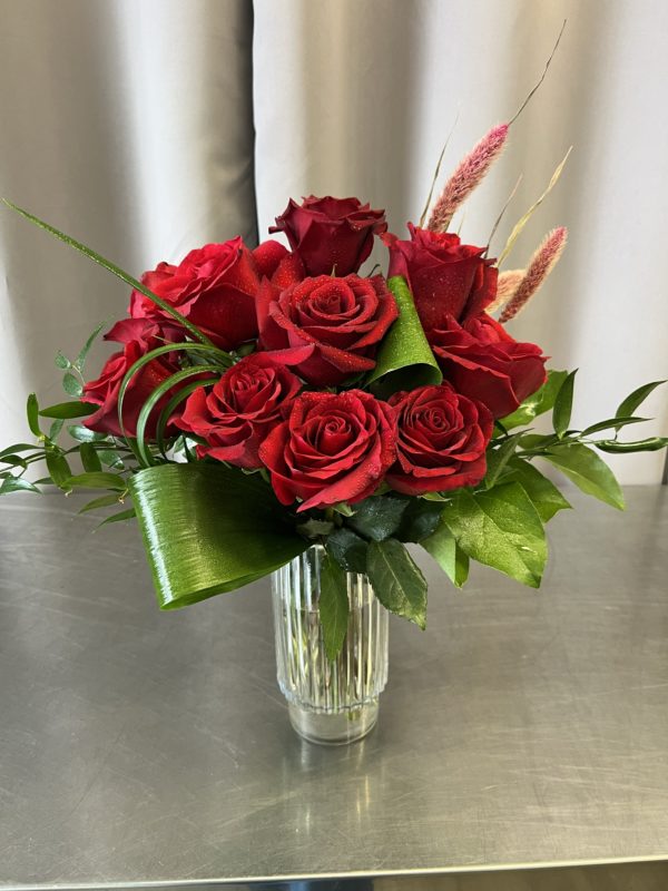 woo, with a stunning arrangement of premium Ecuadorian roses of your choice in a complementing glass vase. Designed to showcase the classic beauty of a rose and is symbolism for love, accented with a soft subtle touch of greenery and dried elements. upgrade to add the extra sprinkle of tulips.